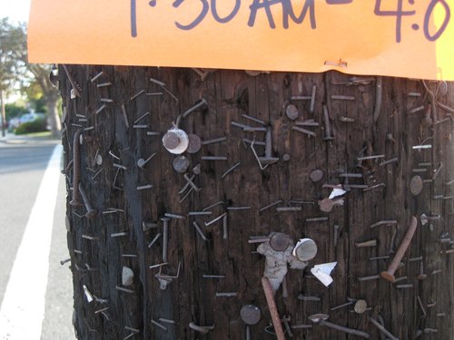 答案: 美國的社區中有舊貨出售時 會把廣告釘在社區電線桿上 所 以電線桿上都是釘子的痕跡