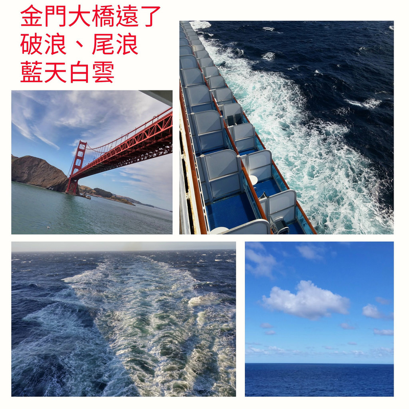 渡假中-1 發佈日期: 2016-06-29 作者: ling 3000人的遊輪,目的地:加拿大、阿拉斯加 紅色箭頭是我與老伴的房間(12樓)貴1000美金。 投影片 1 但是非常值得,有落地門、陽台,視野好、離自助餐近(14樓) 很興奮的上船,浪花吸引著海鷗來覓食 投影片 1 看著舊金山的金門大橋漸漸遠去、看著破浪、看著尾浪 看了許久才心甘情願的倒在床上。 躺在床上的感覺:像是地震、又像是睡在搖籃裡 我想對於會暈船的人是不合適的。 從此刻開始,我將享受11天的海上生活。