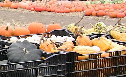 道路兩旁都種著南瓜, 每個南瓜園裡都是遊客